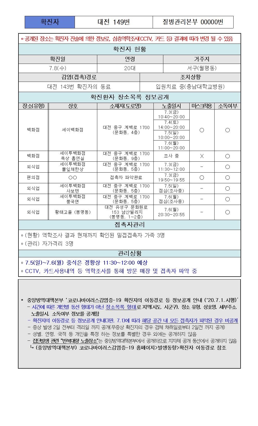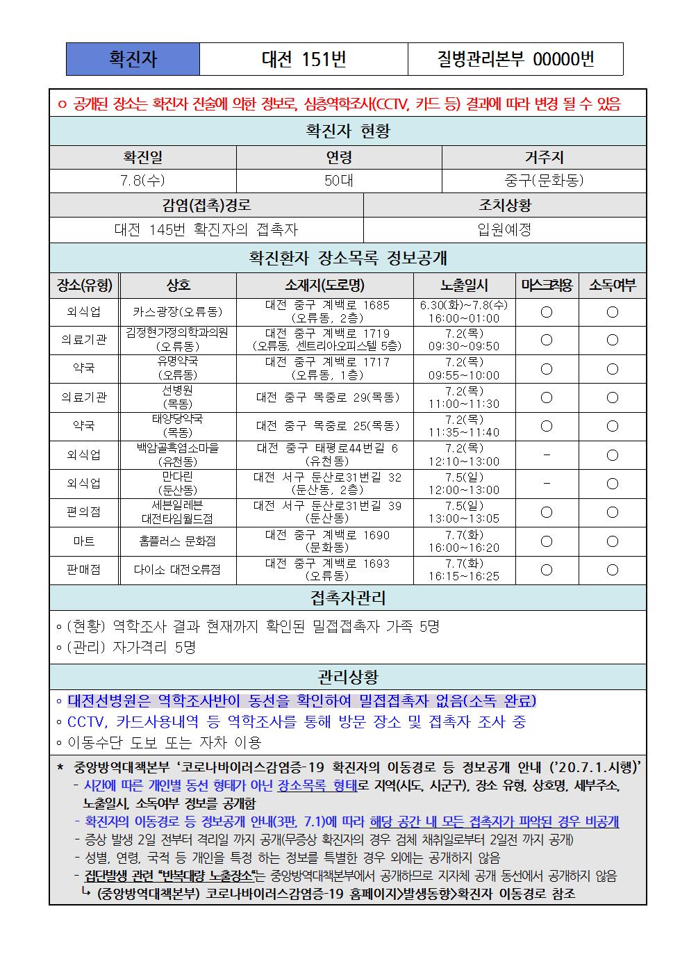 대전 코로나 140~151번 확진자 이동경로입니다.